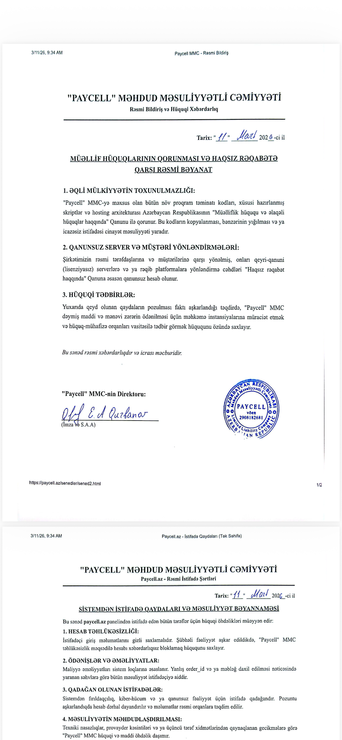 Paycell MMC (bundan sonra "Şirkət") tərəfindən təqdim olunan xidmətlər, proqram təminatı kodları, hosting infrastrukturu və biznes həlləri Azərbaycan Respublikasının "Müəlliflik hüququ və əlaqəli hüquqlar haqqında" Qanunu ilə qorunur. Şirkətimizlə əməkdaşlıq edən və ya xidmətlərimizdən istifadə edən hər bir şəxs aşağıdakı hüquqi məsuliyyətləri qəbul etmiş sayılır: